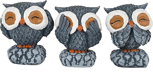 Design: Set of three antique-finish owl figurines with intricate multicolor detailing, adding charm and whimsy to any space.